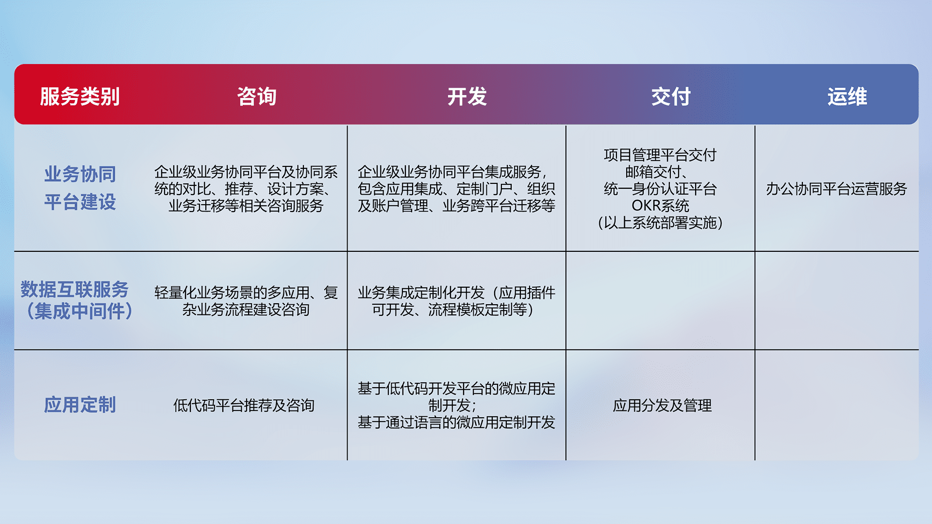 针对钉钉、、企微、、IDaas等平台级产品提供产品的规划、、、方案、、交付、、、、定制化开发等服务,,,,实现如统一协同办公、、、、智能客户服务、、、混合会议管理、、、智能数据查询、、等业务场景,,,,实现数字化转型。。